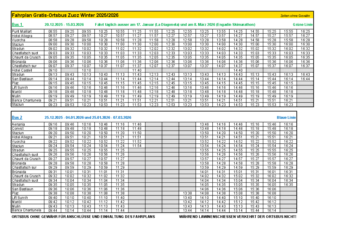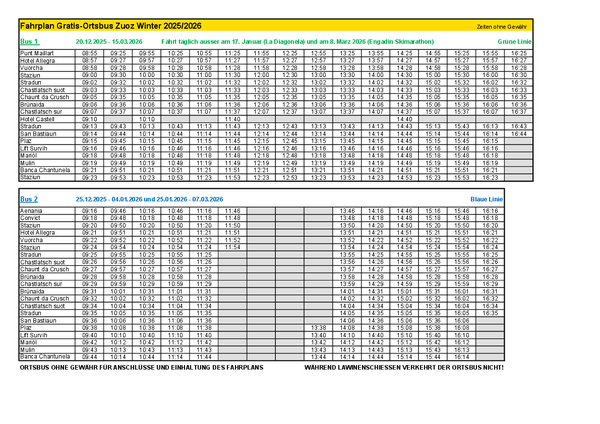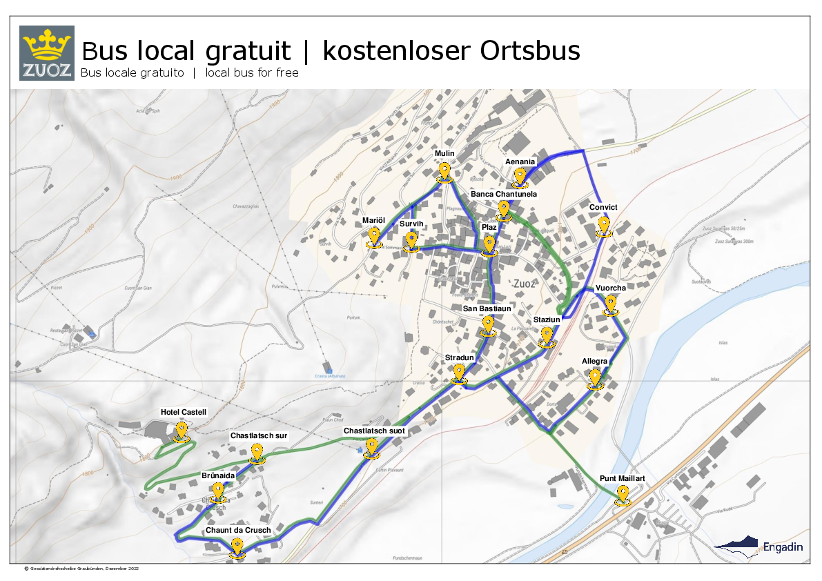 L'autobus locale di Zuoz è a disposizione di tutti gratuitamente. Sia per sciare, fare shopping o incontrare amici, il nostro autobus locale vi porta lì in modo sicuro e confortevole.